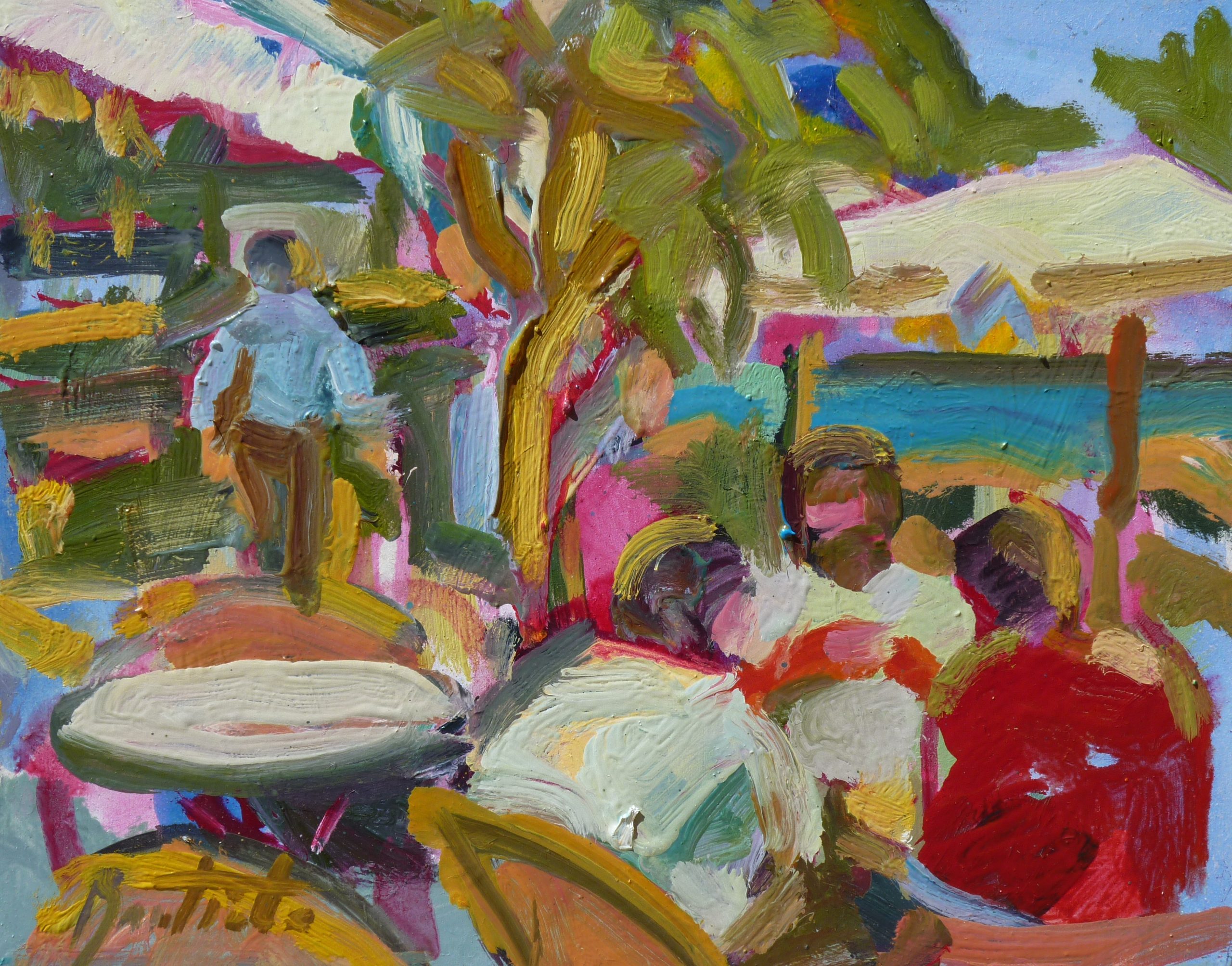 Café en Mallorca, llamado Capuchino, pintado al óleo sobre tabla DM 20 x 25 cm.