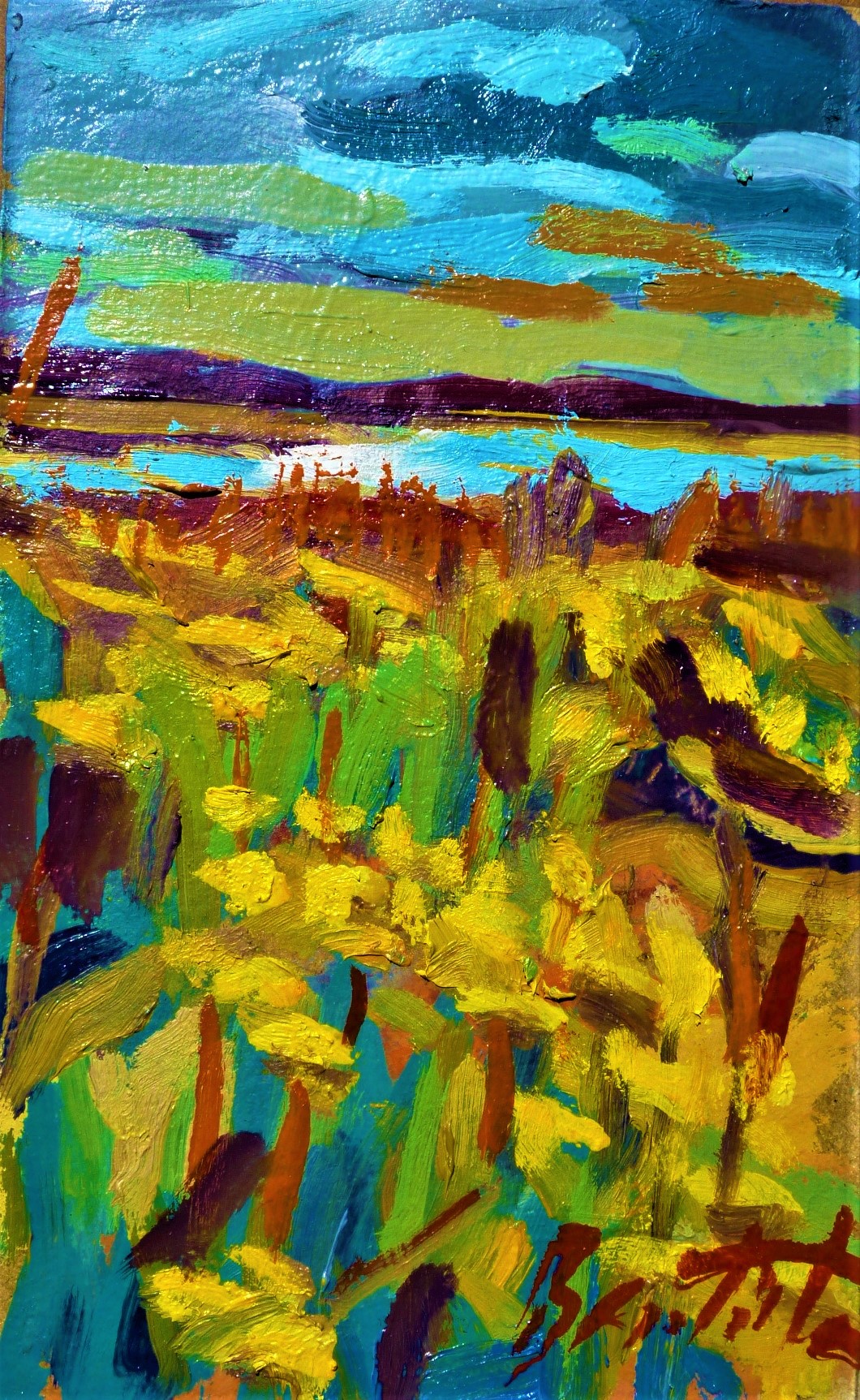 Obra de paisaje rural pintado sobre cartón al óleo de 20 x 12 cm.