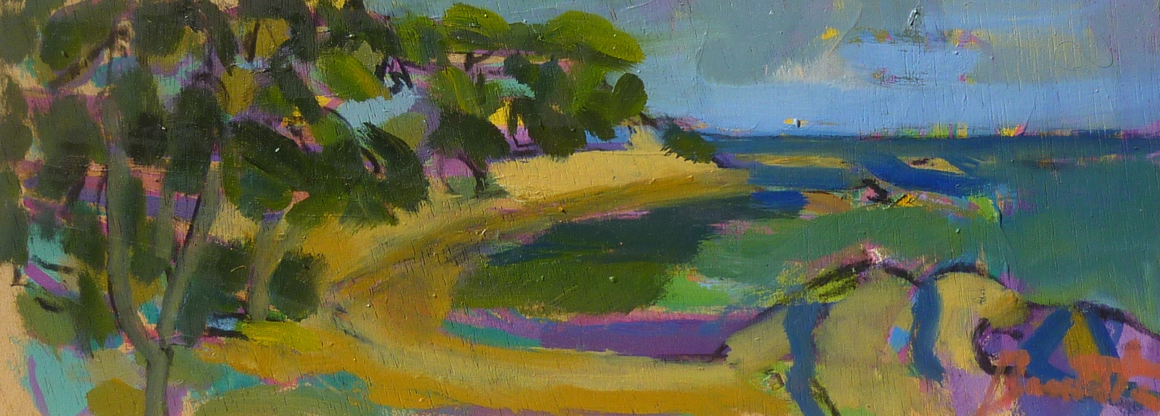 Composición paisajística pintada sobre tabla con óleo de 15 x 40 cm.