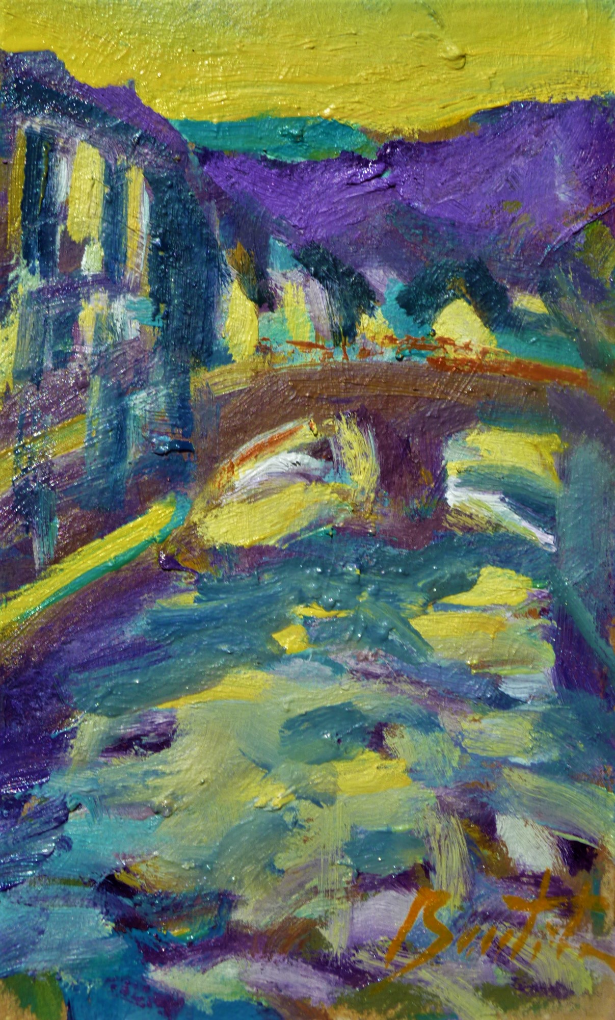 Composición de paisaje rural pintado al óleo sobre cartón de 20 x 12 cm.