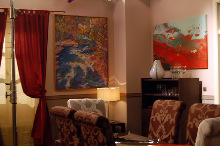 Su intervención ha consistido en la aportación de cinco obras, dos de ellas de gran tamaño que están situadas en el salón y el comedor de la casa de los señores Albiac, en la ficción.